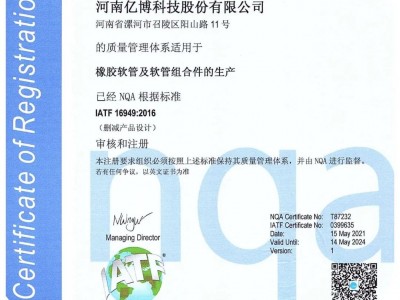097 月 祝賀河南億博科技股份有限公司順利通過IATF16949認證 公司新聞, 新聞中心 0 3,213 近日,公司收到NQA認證公司頒發(fā)的IATF 16949:2016質(zhì)量管理體系認證證書,認證范圍適用于橡膠軟管及軟管組合件的生產(chǎn)。IATF 16949技術(shù)標準為汽車行業(yè)技術(shù)質(zhì)量管理標準,是國際汽車行業(yè)的技術(shù)規(guī)范。該認證證書… 查看更多
